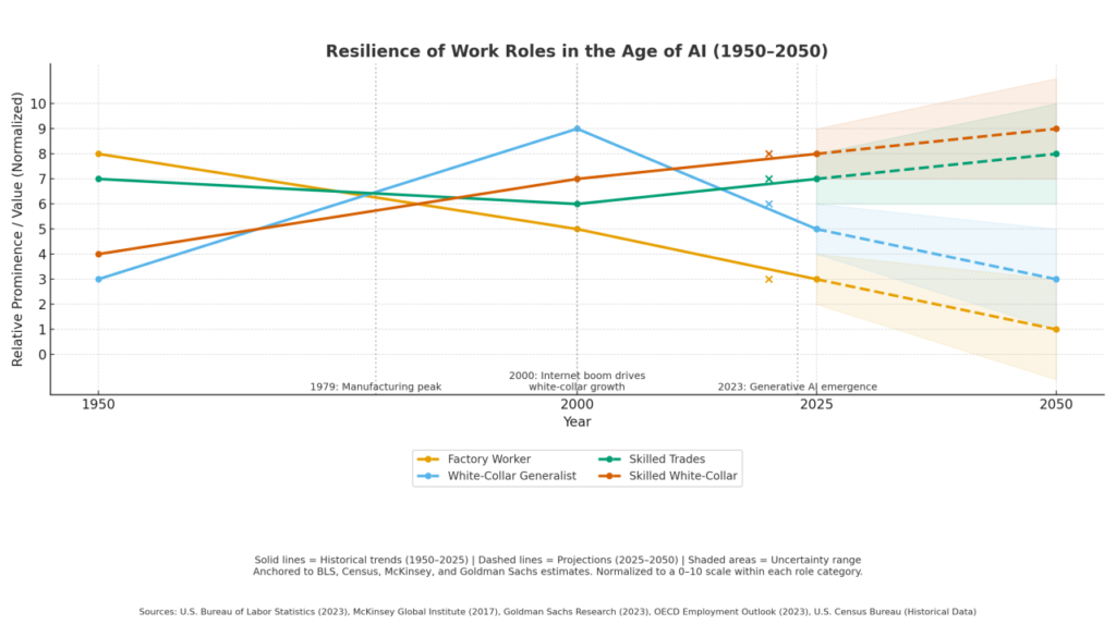 Ryan Ripley from Agile for Humans recently discussed how AI might impact careers in the future. His chart below shows how different work roles such as factory workers, skilled trades, white-collar generalists, and skilled white-collar professionals have shifted in relative prominence since 1950 and how they are projected to evolve through 2050.