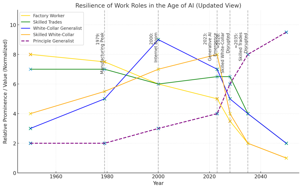 - White-Collar Generalists rose sharply during the internet boom around 2000, but their value is now projected to decrease significantly as generative AI automates routine knowledge work.